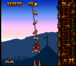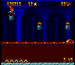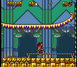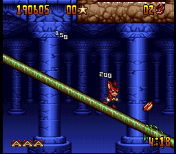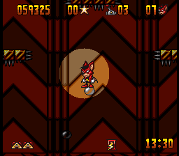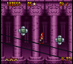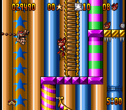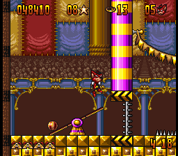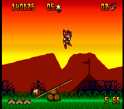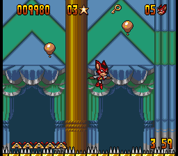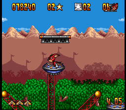 The Genesis version is mostly similar, although it has a few music tracks that are entirely different from its SNES counterpart. One of its bonus stages, where Aero leaps off a sky-high diving board towards a pool of water in Mode 7, also had to be cut. In its place is a 2D stage inside the circus where Aero bounces off one one of the diving boards previously seen in the game towards a pool below.