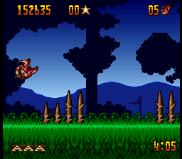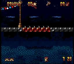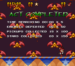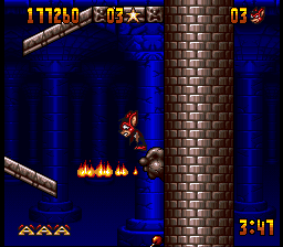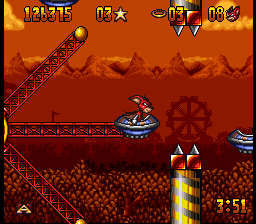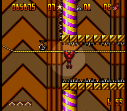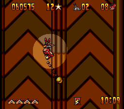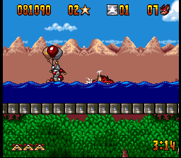 The graphics, while somewhat basic by the standards of 1993, serve well enough. The sprites on the smaller side, which at least usually prevents you from running into things you can’t see too often. While he’s not the most exciting of characters, Aero has a few cute animations like his moonwalking between stages, or the way his eyes bug out when one of the bosses grabs him, that help to give him enough life. The stages, however, are somewhat on the bland side, although they’re at least colorful and distinctive enough on their own. The music is almost overpoweringly loud on either end, but once you get used to it, its bouncy, fairground organ-esque soundtrack fits well with the game’s general theme.