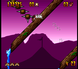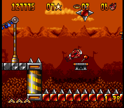 While Aero isn’t quite as fast as Sonic, he makes up for it with a fairly robust set of moves. The one you’ll be using most often is a head-first drilling attack you can perform in the air, aiming it diagonally upwards or downwards as needed. It serves as both a double jump and your primary form of offense, letting you take out enemies both airborne and on the ground. Care needs to be taken, however, as the downwards drill will carry Aero across the floor when he reaches the ground, potentially dragging him into one of the many, many hazards. More rarely, you’ll also collect magical stars that can be thrown, best saved for enemies too dangerous to get close to.