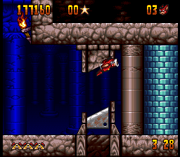 Placed almost as commonly as the spikes are various secret areas scattered throughout the level, usually placed just behind false walls. Each of these secrets usually contains an extra life, along with stars, health, and food for bonus points. You’ll want to look out for as many secret areas as you can, as you’ll quickly chew through all the lives the game is hiding as quickly as you earn them. Health is almost just as valuable – Aero can take up to five hits, but pick up more than that and they’re wasted, meaning you won’t have them later should you have to revisit the area you grabbed them from. At the very least, checkpoints are reasonably common, often placed just before and after particularly annoying sequences.