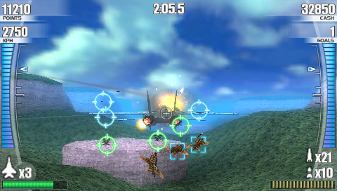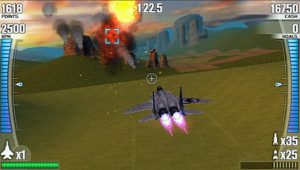 In addition to the standard Vulcan cannons and heat-seeking missiles, you also have an air-toground cannon to destroy land based targets. If you destroy multiple enemies simultaneously you’ll get a combo bonus, which spawns a bonus crate containing health or ammo replenishments. You also execute a 360 roll by pressing the triangle button, which is practically required to dodge projectiles. It takes some getting used to, because it’s hard to see incoming missiles with all of the action going on, and trying to dodge bullets is unnecessarily difficult. Although you have a damage meter and multiple lives per stage, it’s easy to burn through all of that if you’re not paying attention. If it becomes too frustrating, you can always set the game to Easy, because you can take plenty of hits.