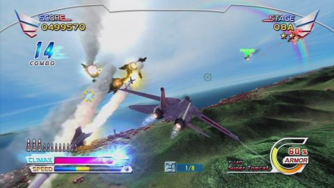 The core gameplay is much the same as it was in After Burner II, though some elements have been borrowed from Sky Target. You now have an armor meter allowing you to take a few hits before crashing, and missiles slowly regenerate on their own, so technically you can never run out. There are three different jet fighters – F-14D Super Tomcat, F/A-18E Super Hornet and F-15E Strike Eagle – though there’s not much of a difference between them. The stage route has a few branching paths, plus a handful of “secret missions“ that require you to destroy specific enemies and can also open up different levels. There are also three different endings, based on the route you take as well as how successful you are with secondary objectives. There’s also the “Climax“ gauge, as referenced in the title. As you destroy enemies, it quickly fills up – when maxed out, you can use it to slow down time and target an unlimited amount of enemies with an infinite supply of missiles, making it quite handy for those moments when dozens of bad guys appear on the horizon.