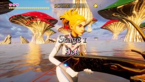 The comparisons are numerous, though subtly changed a bit to avoid stepping on Sega’s intellectual property. Rather than a sunglasses-wearing blond guy, you control blond lady Princess Arch, another flying warrior, defending her world AIR from invading aliens. Enemies will look familiar, including various floating geometric shapes, long-tailed dragons, jellyfish, along with foes like flying elephants. Each of them flies onscreen with a little sound effect, floating around in formation before lobbing bullets and flying away. The first level opens with a narrator yelling “Protect your planet. Get Ready!” and strong attacks will send Arch flying the ground, accompanied by an echoing scream.