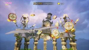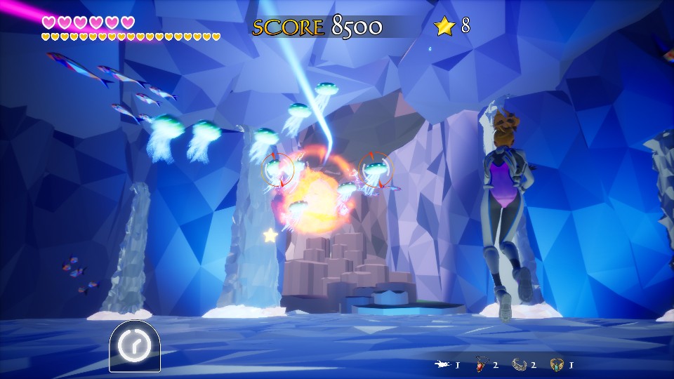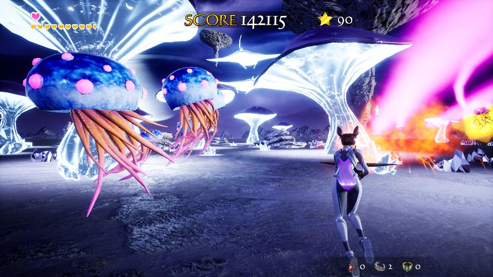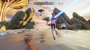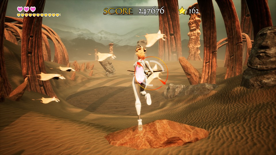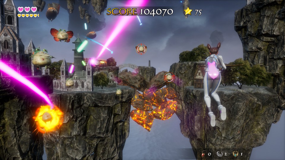 Along with these are plenty of ways to customize Arch, including changing her outfit, hair-style, and face paint. Go ahead, give her a witch hat with cat face makeup and a broom! There’s a lot of fluff to unlock here, as it’s unlikely you’ll ever use any of the minor color or design variations, but along with the score attacks, it’s a good way to keep you engaged beyond the couple of hours it’ll take you to beat the main game. Also included are several minigames and extra stages, some of which are pretty inscrutable, but let you earn extra stars outside of the main game.