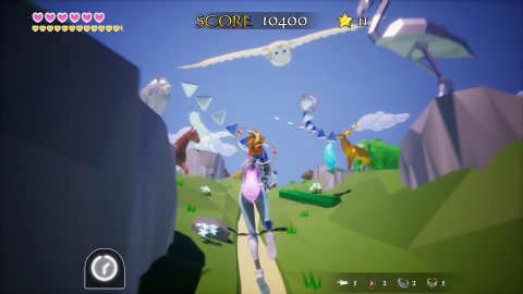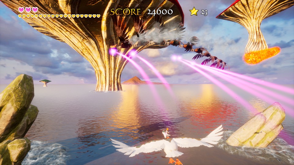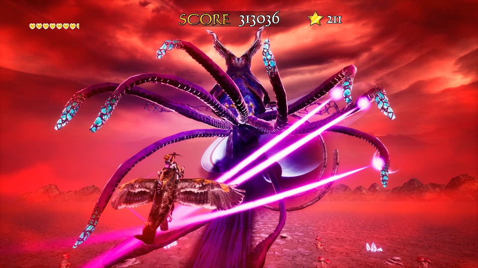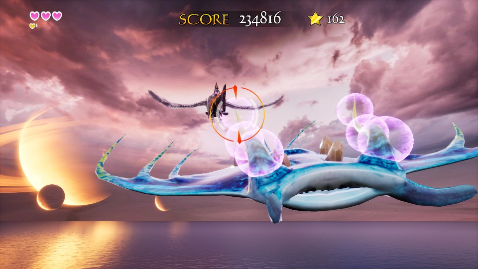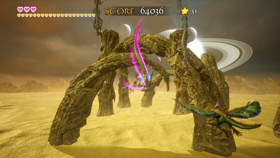 Of course, the Super Scaler games never quite went away, they just evolved as the industry moved to 3D, including games like Treasure’s Sin and Punishment, Nintendo’s Star Fox, and Sega’s own Panzer Dragoon. On the other hand, Air Twister feels closer to its roots, most closely mimicking Space Harrier with only a handful of improvements. The most useful is the lock-on laser, which automatically targets any enemy that flies in front of you and unleashes a multi-projectiles blast when you unleash it. You also get the ability to slow down time for a few seconds, which is especially handy for boss fights. Whenever you fight a boss, you hop onto a flying animal friend, ranging from swans to dragons, though this doesn’t change much of anything. But you won’t find anything like Panzer Dragoon’s Berserk attacks, Star Fox’s branching paths, or Sin and Punishment‘s dodge rolls.