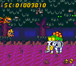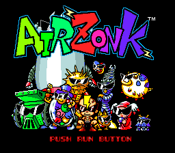 In many ways, it’s a typical side scrolling shooter, but Air Zonk stands out due to the incredible arsenal of weaponry. By himself, Zonk is equipped with a rapid fire gun. He also has flame jets in his feet, allowing him to roast enemies that get too close to his rear. There are over half a dozen standard weapons found in power-up capsules, including punching gloves, boomerangs, alligator teeth, lasers, and homing missiles. One of the most common is one which shrinks Zonk to minuscule sizes and allow you to aim in any of the four directions while moving. The weapons also have the added benefit of allowing you to take an extra hit before you get killed. You can also charge up your attacks with the I button, although not all of the weapons have a super attack. Hold it for a few seconds and you’ll unleash a bomb that will damage almost anything on the screen.