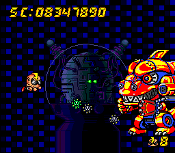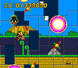 There are a number of graphical differences between the North American and Japanese versions. In the Japanese version, the intro starts with the PC Genjin logo appearing, whereupon PC Denjin flies by and smashes into it. In the North American version, Bonk is standing on a building, and then puts on a pair of shades, transforming into Air Zonk. In the Japanese version, the charge bomb looks a bit like a pile of poop (it does look like he’s straining himself when he’s charging), but it was changed into a regular looking bomb for North America. When assembled with the cow partner, in the Japanese version, PC Denjin puts on a bit of lipstick and fires milk bottles. This was perhaps too suggestive (the milk bottles kinda appear to be giant nipples), so his whole body was changed into a cow in the North American version. Also, while the partner and stage names are written in English in the Japanese version, they were all changed for the North American release. The score display was also changed.