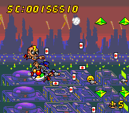 There are only five stages in Air Zonk, although they’re pretty long. Each stage takes place in open air, with no real terrain to navigate, just an onslaught of enemy patterns. It also has some of the best looking parallax scrolling on the system, and looks surprisingly natural compared to most other 16-bit games. All of the levels are artistically gorgeous, with some inventive locales – one takes place in a baseball stadium, another has Bonk flying through a futuristic fortress, with graphics from the first stage of Bonk’s Adventure painted on the background. Most of the enemies are variations on the foes from the Bonk games, including mechanical dinosaurs and such. The soundtrack is fantastic, again boasting one of the best chip generated scores on the system.