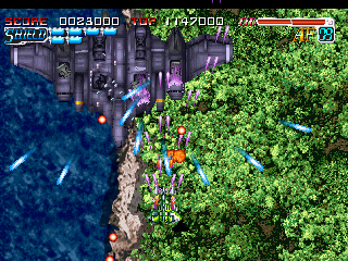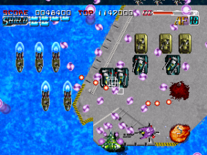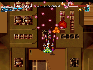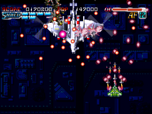 While the gameplay here isn’t much different compared to Stahlfeder, Airgrave goes back to the genre fundamentals established by Xevious through an increased emphasis on grounded enemies. As you shoot, you’ll automatically launch bombs meant for grounded targets, but if you hold the shot button, you can pull up a targeting cursor andlock-on to multiple enemies simultaneously. The lock-on often feels too slow to keep up with the speed of the action, but if you can get the hang of it, you’ll earn bonus points for eliminating specific grounded targets in each stage. As you defeat enemies, you also build up meter for an Overdrive mode, which lets you shoot more bullets and lock-on to grounded targets instantaneously. It’s a useful panic button, but one that doesn’t remove all of the challenge since you’re not invincible during it.