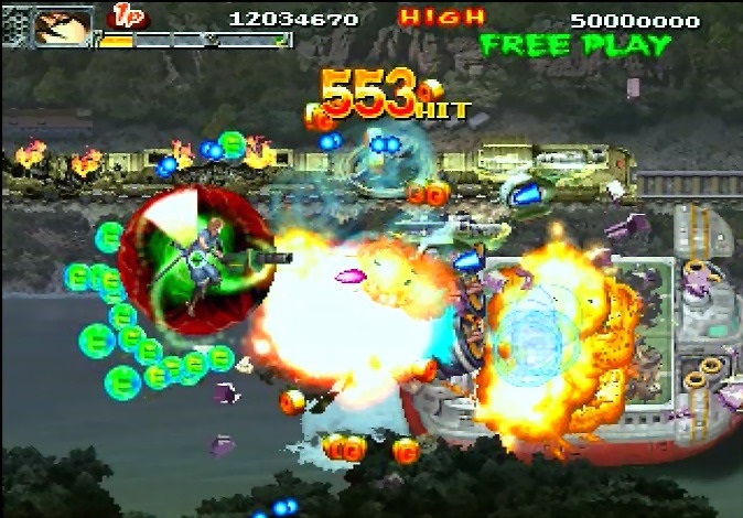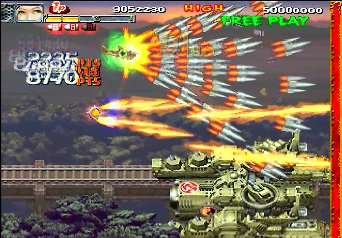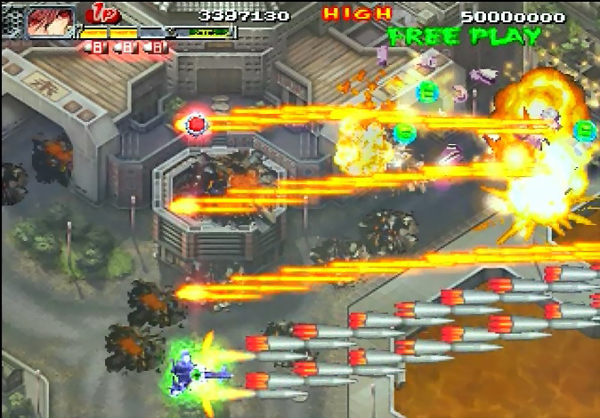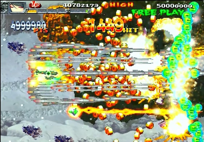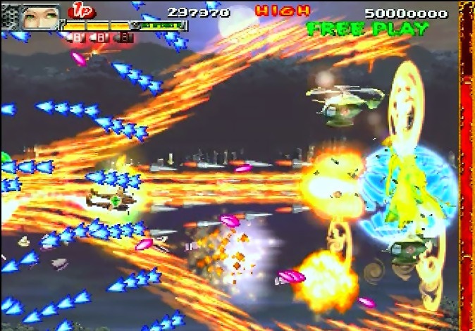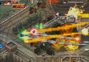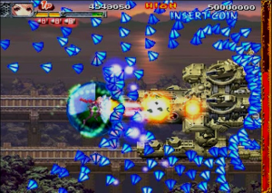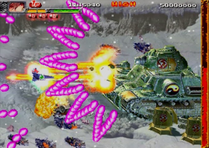 During gameplay, players control their airplane via an eight-way joystick, and four buttons. Tapping the A button causes the player’s ship and option to fire the Shot weapon as well as have the player’s option move about freely. This is known as “Defense Mode”. Holding the A button down causes the player’s option to behave in a special way (depends on ship) and causes the player’s ship to maneuver at a slower pace. This is known as “Attack Mode”. The ship’s Shot strength also decreases when the A button is held, but the option’s Shot strength is increased while in Attack Mode. The B button releases a bomb that cancels all bullets on screen, damages all enemies on screen, and causes the player to become invulnerable for a short period of time. The C button serves as an auto-fire button, rapidly tapping the A button. The D button causes the airplane to shift between “Fighter” and “Phantom” modes.