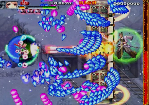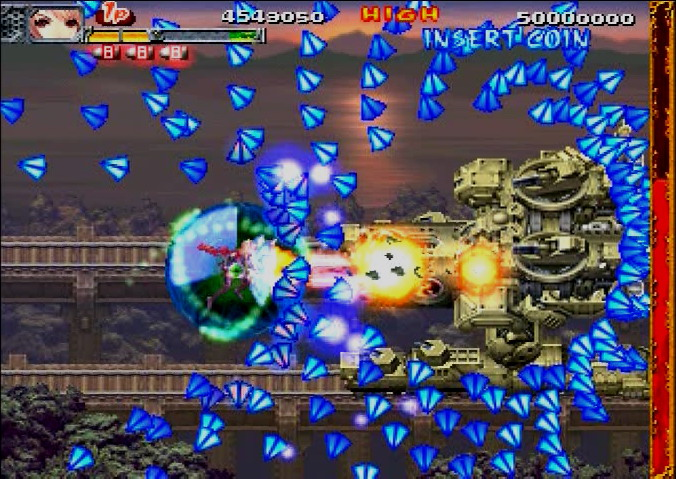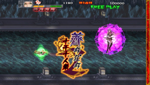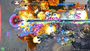As stated before, losing a life extends the player’s Phantom Gauge. Although tempting, there is no real need to deliberately do so. The default length is just fine, although players will be required to perform some expert energy regeneration techniques to keep up. And, not to mention that spare lives are worth eight million points each at the end of the game, which is a decent amount, relatively speaking. Bombs, however, are worth much less, and Akai Katana may be Cave’s most lenient and forgiving bomb system yet. Using a bomb doesn’t break the current HIT chain like DoDonPachi games, or even diminish it like in Mushihimesama Futari. Bombs can also do some serious damage to bosses, even in the later stages. So the thing with bombs is to use them if the player needs to, as there is really no downside in doing so. Also, if the player is on their last life and has at least one bomb in stock, getting hit will automatically cause an auto-bomb to go off, taking the all of the player’s current bomb stock.