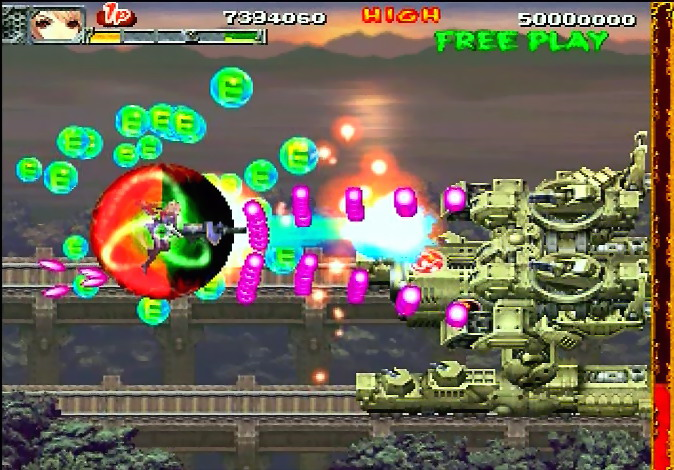 It wouldn’t be a Cave shooter without some sort of True Last Boss now, wouldn’t it? Akai Katana is no exception to this, though the requirements for triggering the TLB and the “good” ending are pretty lax. Simply play through Stage 6 without dying, and the TLB will be triggered in Stage 7. Failing to trigger the TLB just pits the player against the normal Stage 7 boss, but leads to a “bad” ending, which can be kind of a downer.