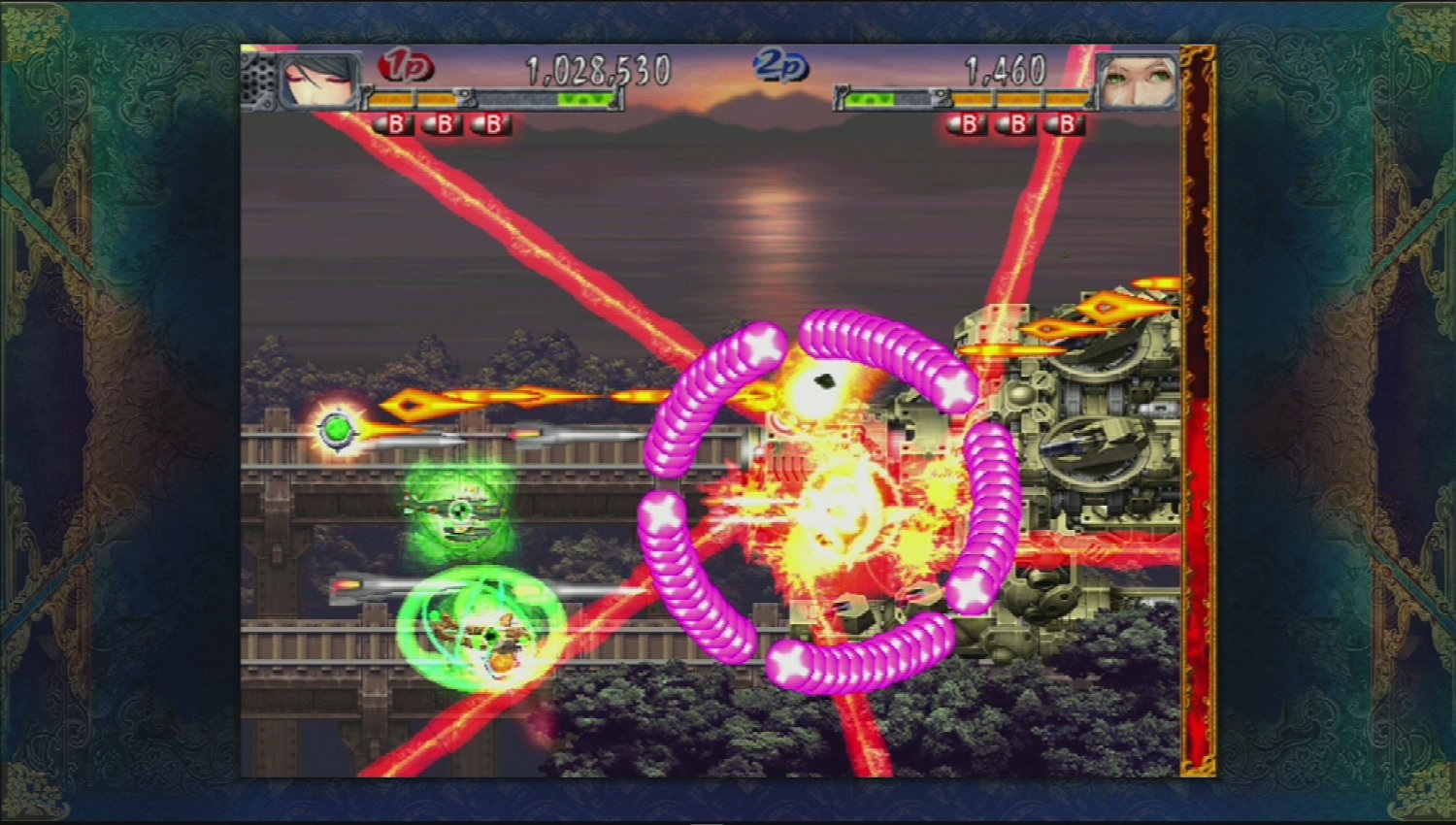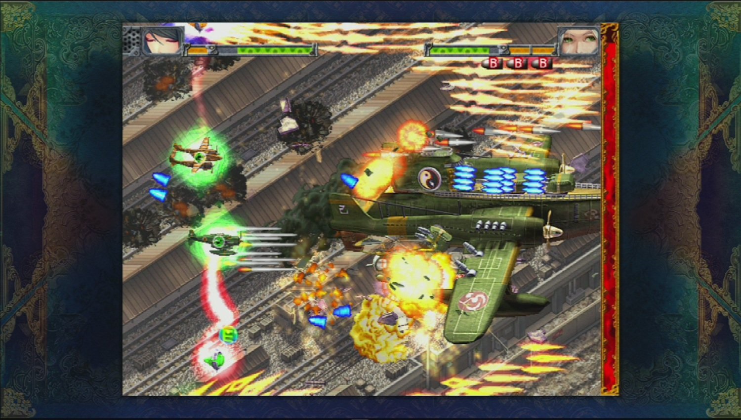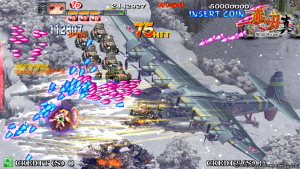 Although there are six main characters in Akai Katana… three of them are actually dead and have become “Guardians” for the remaining three characters, each of whom is tied to a specific airplane. Sumire and Tsubaki pilot the Type 1 Marigold, the Saionji siblings pilot the Type 2 Orchid, and Suzuran and Shion use the Type 3 Sakura plane. Of these, the Type 3 Sakura, feels the most DoDonPachi-ish. There aren’t any weapon power-ups in Akai Katana, so players are at their strongest right from the get-go.