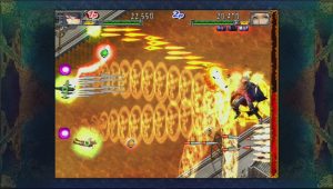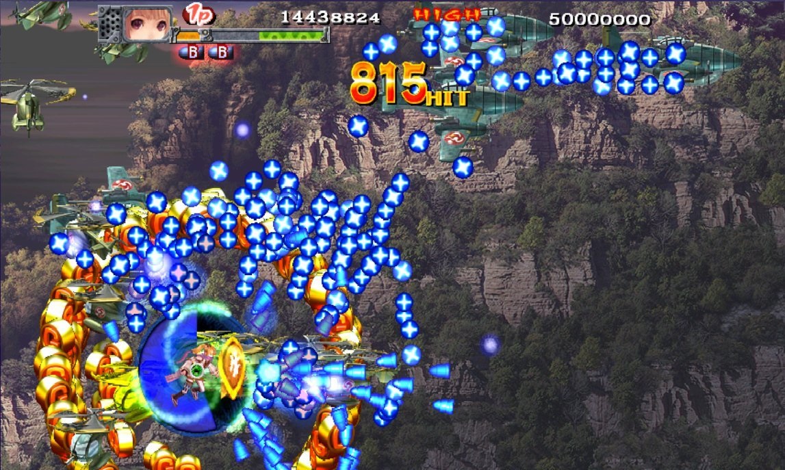 In the top left corner of the screen, there is a picture of the current pilot, along with a segmented gold bar on the left and a green bar on the right, with a few B icons underneath it. The gold bar represents the number of lives the player has remaining. Each segment represents a life, and when it hits zero, it is Game Over. The green bar to the right is the Energy Gauge. Collecting energy items from enemies will cause this gauge to fill, allowing the player to transform into Phantom Mode. If a player loses a life, they will lose a segment of the gold bar, but in turn extends the green Energy Gauge. The “B” icons underneath the player’s Life Gauge represents the number of bomb items the player has.