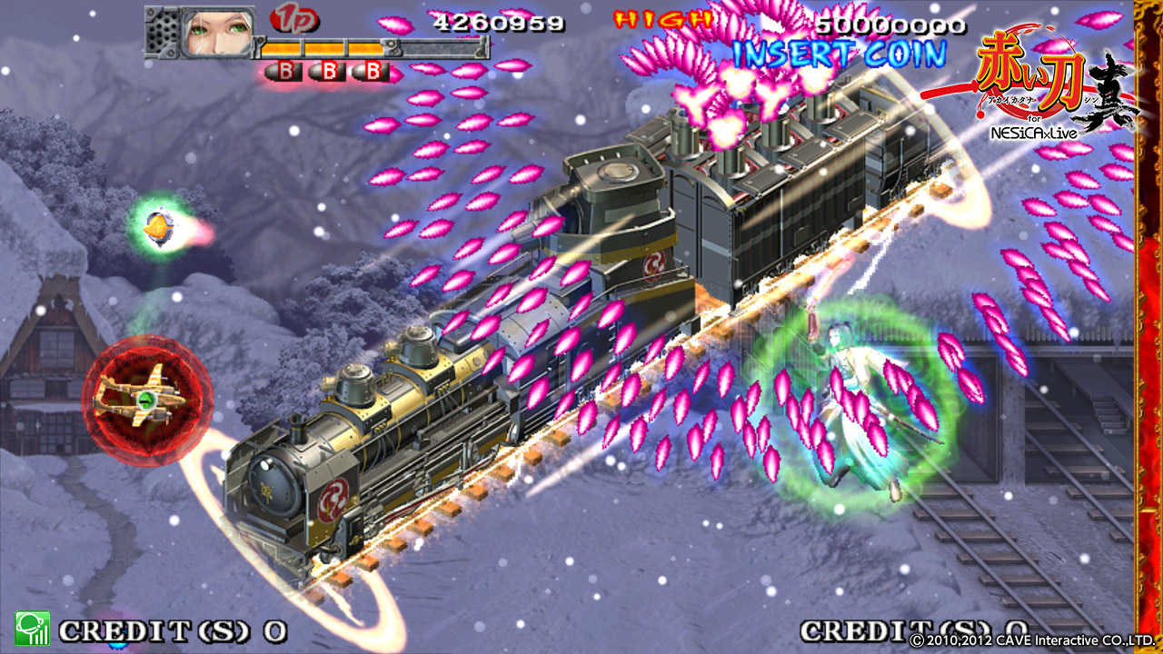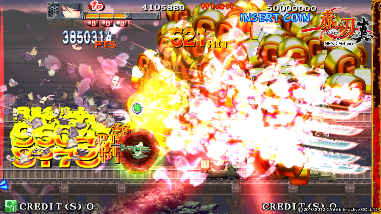 In July 2012, Cave released Akai Katana Shin for the Japanese-only NESiCAxLive arcade game delivery system. In a nutshell, NESiCAxLive was developed in late 2010 by Taito is an online arcade distribution system that allows arcade operators to download games from Taito’s central servers instead of having to buy and house PCB’s. Think of it as a multi-slot Neo Geo MVS arcade machine for the modern age. This is where things may get confusing. In Japan, the Xbox 360 port of Akai Katana was released as Akai Katana Shin. In the port, there was also a mode called Shin, known to the west as Slash, and it is this mode, that was released for the NESiCAxLive system, not the entire Akai Katana Shin port. Additionally, the game uses the original arcade graphics, rather than the HD versions from the port. The game itself is exactly the same as Slash / Shin.