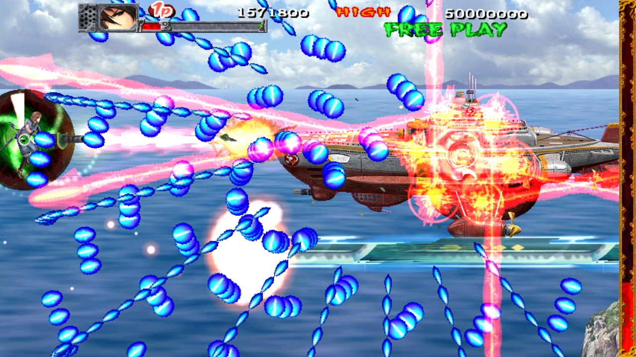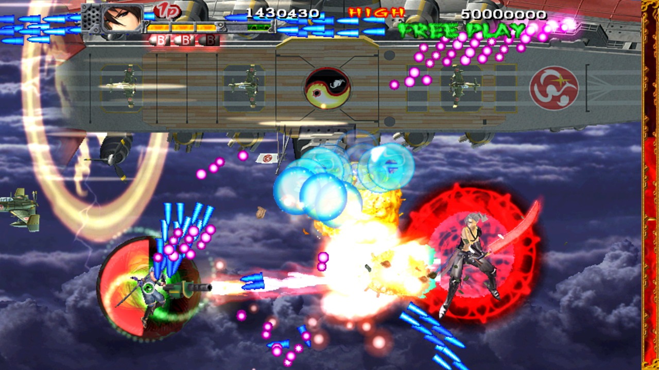 In 2008, Cave released DoDonPachi Dai-Fukkatsu into Japanese arcades. The game was to be a “Grand Resurrection” of the DoDonPachi series, and was met with high praise from fans. So how could Cave possibly top a grand resurrection of their flagship series? It’s unclear, but making a game where ninjas fought against other ninjas throwing huge battleships at each other is certainly a good start. That game would go on to become Akai Katana (lit. Red Sword), and it ran on the CV1000-D version of the SH3 hardware, which was first used with DoDonPachi Dai-Fukkatsu. The CV1000-D is the same hardware as Cave’s regular SH3 hardware, but featured more ram than its predecessor. Akai Katana was directed by Shinobu Yagawa, a former employee of Raizing, and creator of cult classics such as Summer Carnival ’92: Recca , Battle Garegga, and Armed Police Batrider. Set in a parallel version of modern Japan, Akai Katana aimed to create a world that would have battleship-throwing ninjas seem believable and not out of place, in addition to having it be a fun game to play, and Cave certainly succeeded on that front.