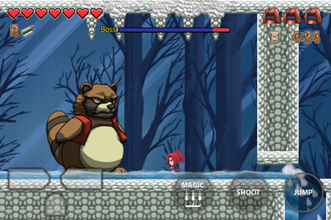 Depending on aesthetic preferences, it may take a while to get over the cutesy graphics. The quality also betrays the low budget, but they’re still looking very good for an indie game. The huge bosses look great, only the animations make them look like they’re from an upscaled 8-bit game, which clashes a bit with the high resolution. What little assets the game has it makes great use of, though. Especially the way enemies bounce to the ground when it, accompanied by excellent sound effects, makes them seem to have real weight, and killing stuff thus manages to feel satisfying without resorting to gory effects. The way kunais bounce back from walls and then fall down is likewise a sight to behold, especially when applied in huge numbers. Backgrounds are only sparsely animated, but while they look somewhat dull on still images, the parallax scrolling is simply amazing. The music’s also pretty cool, but most tunes are a bit too calm for the genre, and sound more like something out of a stealth sequence in a spy thriller. Only the rocking boss and final level tracks really fit the mood. Aside from the melody played during the short intro sequence, the soundtrack also doesn’t really try to correspond to the oriental setting.