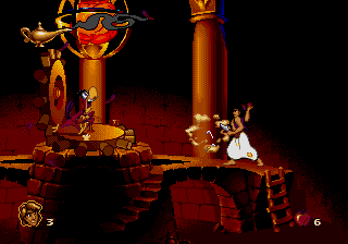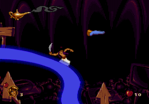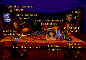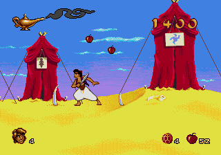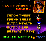 Most of the music is taken from the movie, primarily Alan Menken’s vocal songs. Surprisingly, these are all rendered excellently within the limits of the Genesis’ FM synth, despite missing the lyrics. There are a few original songs added in, primarily the fun “Camel Jazz” and the exciting “Arab Rock” themes provided by recurring Virgin composer Tommy Tallarico as well as Donald Griffin.