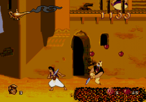 The game was programmed by David Perry, a programmer who had worked on a few other titles for Virgin, including Mick and Mack Global Gladiators and Cool Spot, and later went on to create Earthworm Jim. As a result, it feels very similar to those games. Before Virgin began work on the project, he was actually working on a Genesis version of The Jungle Book, but his engine was adapted for use with Aladdin. (This game was later finished by Virgin without Perry’s involvement, as by that point he had left to form Shiny.)