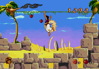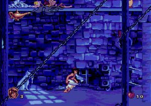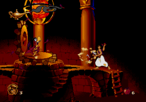Both versions also have controls and physics that are very slightly different from the Genesis version, the most noticeable being the lack of a super jump that originally allowed Aladdin to leap extra high and grab items normally out a reach. Without this, these items are extremely difficult if not impossible to obtain. The Amiga joystick only has two buttons, so you need to use some other method to switch between the apples and sword; meanwhile, the IBM PC version lets you map your controller, but a glitch will cause them to use the same button regardless of what you tell it to use.