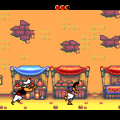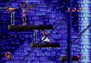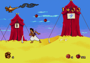 Beyond the style, the level of detail has a certain level of authenticity that transcends not only the SNES game but most licensed games in general. One particular type of enemy swordsman routinely loses his pants, a reference to a quick shot of a guardsman in the movie. In fact, many of the enemies are taken from various minor characters, including the knife throwers, as well as occasional appearances by Iago the parrot. The backgrounds contain fun little games, like tents that act as outhouses for men, women, and genies. Various skeletons have little Mickey Mouse ears on then. When you run out of health, you don’t technically “die”, but rather the Genie calls a time-out and gives Aladdin a rest and a shoulder rub before restarting the level. Not every gag is lifted from the movie either, but everything here keeps with the same tone, making it feel like a logical extension.
