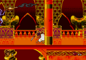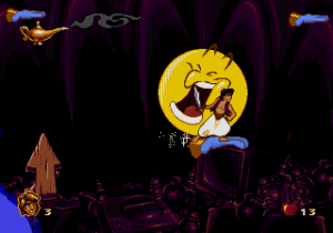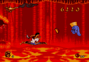 The main hallmark of a David Perry game is the large, sprawling levels, that scrolled multidirectionally rather than just being forced from left to right. His earlier titles had elements that required exploring the stages for collectibles, which is greatly scaled back for Aladdin (only one of the stages requires this). In spite of the more linear nature, Aladdin’s path still sends him zig-zagging through the levels, often with small branches that lead to bonus items. These include apples, which are collected and used as ammunition to throw at enemies; gems, to be used as currency to purchase stuff from shopkeepers, like extra lives or “wishes” (continues); Genie tokens, to allow you to play a slot bonus round; and Abu tokens, to unlock another special stage starring Abu the monkey, where you need to dodge falling pots. Stages occasionally have foreground elements that can hide items too, giving a more three dimensional texture to two dimensional levels. The levels include two areas that take place in the Agrabah Market, a trip through the desert, exploring the Cave of Wonder (and subsequent escape, including riding on the magic carpet as you fly from a wave of lava), a goofy area that takes place inside the Genie’s lamp, and then two stages in the palace, where you face off against Iago and Jafar.