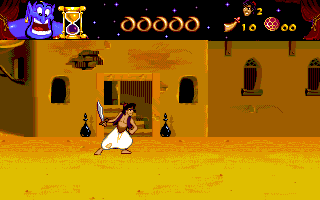 Both versions feature music redone in the Amiga MOD format, which uses samples rather than the FM synth of the Genesis. It sounds weird when comparing the two, but on their own merits, it’s a pretty good rendition. It even adds some lyrics to the “A Whole New World” theme. However, the “Camel Jazz” theme was replaced with something different, and it’s missing several music change cues. For example, the music is supposed to stop when Aladdin runs out of health or plays the end-of-level slot machine, but they continue to play here. Altogether, these ports will definitely feel off to anyone who’s played the Genesis version, but for the market it was intended – families who owned computers but not game consoles – it’s close enough.