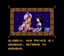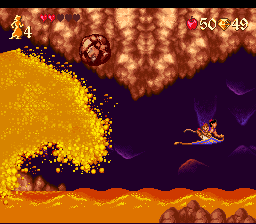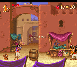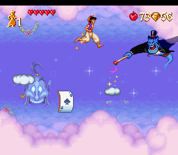 The game follows a rather abridged version of the film’s events, with some creative liberties. All the major beats are there – the initial escape from the guards in Agrabah, the Cave of Wonders, and the carpet ride with Princess Jasmine. There’s also a couple of game-exclusive levels to pad out the game’s rather short length, like the wacky dreamland interior of the Genie’s lamp. The most obvious change is the penultimate stage, in which Aladdin has to venture through an Egyptian pyramid to find his monkey companion, Abu. Between stages, there are also cutscenes with unique art, which serve as a basic recap of the film’s plot.