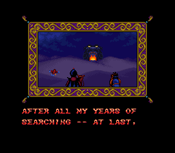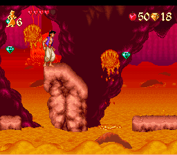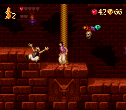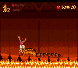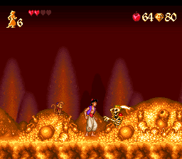 There’s just enough breaks in the platforming to keep from getting too stale, like a couple of auto-scrolling levels featuring the magic carpet. One of them is one of the toughest challenges in the game, forcing you to navigate a tight tunnel, all while avoiding the instant-death boulders and the wave of lava that constantly reaches towards you. The other is a romantic carpet ride with Jasmine, serving as a relaxing bonus stage and a nice breather between a couple of especially tricky stages. There’s also a handful of boss fights, with the final battle with Jafar’s snake form being interesting for featuring a Genesis-style segmented sprite. It’s a rarely seen effect, but between the fire in the foreground, the projectiles Jafar spits, and the snake’s constantly shifting body, it slows the poor SNES down to a crawl.