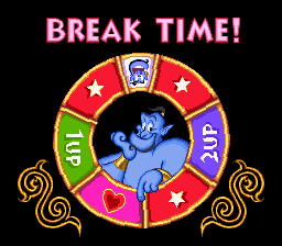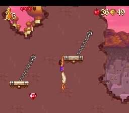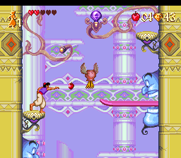 It might clock in at a little less than an hour, even if you’re going for all the red gems, but the game at least stays interesting while it lasts. The platforming stays solid throughout, typically testing how good you are at keeping a chain of bounces going. Later levels add new foibles like moving platform you have to repeatedly bounce off of, Genie balloons that have to be traversed across before they pop, and wheels that have to be turned to get a platform moving on the right path. It only starts to get difficult near the end of the game, where you’ll often have to deal with long stretches suspended over the void, but the stages are short enough and checkpoints so frequent that the challenge stays mild. Even if you can’t make it on three continues or more, the password system will let you jump all the way to the final boss.