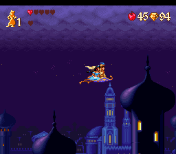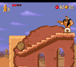When it comes to the graphics, the SNES version absolutely pales in comparison to the visual spectacle of the Genesis version. That’s not for lack of trying, however, as the sprite graphics carry their own charm. There’s some nice touches like having the guards laugh if they manage to hit you, and you’ll periodically see Abu getting up to various antics if you keep a close eye on him. The sprites might not be as large or as fluid, but that carries the silver lining that the controls are tight and the hitboxes always work as expected. The soundtrack only carries a couple of tracks from the film, and while the original compositions are decent, they feel a little bland compared to what was borrowed from the movie. A lot of them sound suspiciously similar in instrumentation to Super Ghouls N’ Ghosts, as well.