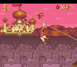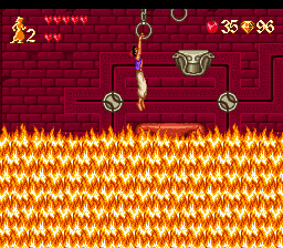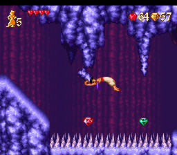 One particular feature that really sets this version apart are the variety of acrobatic moves and stunts that Aladdin can perform. He can catch ledges to help make tricky jumps, which makes the platforming vastly easier. He can also swings on certain objects like poles and stalactites, using them to kick any enemies that get too close. There’s a few certain points where you’ll do all these moves in one continuous flow, and when you’re able to pull it off, it always feels satisfying. It definitely helps add some spice to the platforming, and it’s far more accurate to the stunts Aladdin does throughout the movie.