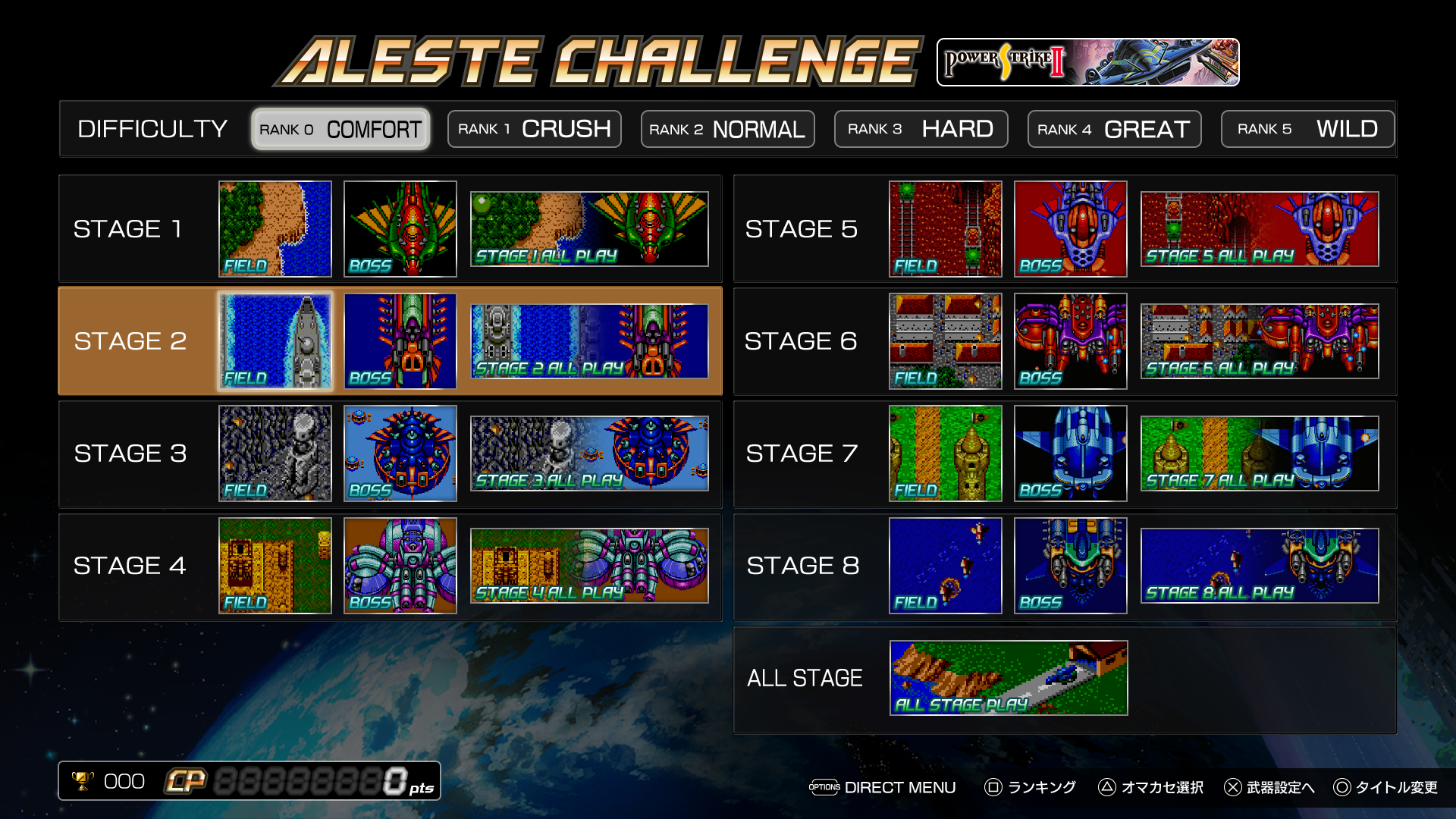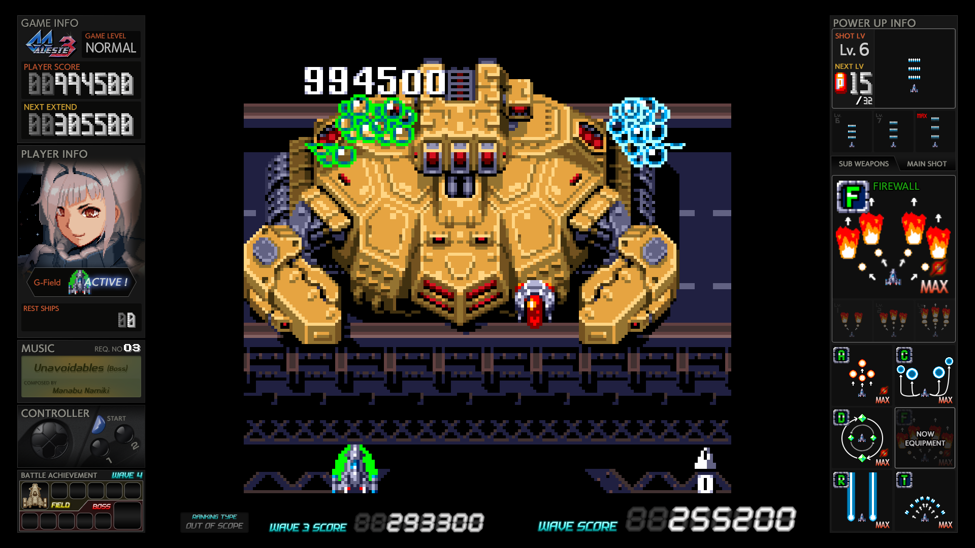 This package is also part of the M2 ShotTriggers series, and so it features its signature “gadgets” floating around the side of the screen, which highlights some of the game’s inner workings. Since these are 8-bit titles, there’s nothing too complicated about them, so these displays mostly show things like how many points you need to gain to get an extra life, or how many P chips you need to increase your power weapon. Each game also adds a portrait of either your ship or the pilot, as well as a breakdown of all of the subweapon types. Power Strike/Aleste also includes an “Auto Level Control” indicator, which is the hexadecimal code used to determine what kind of enemy waves would be generated. This was last seen in the MSX versions of Zanac, though its actual meaning is just as cryptic here as it was there. As expected, there are save states, plus a separate Aleste Challenge mode, which lets you jump to any level and boss fight, also allowing you to choose your arsenal.