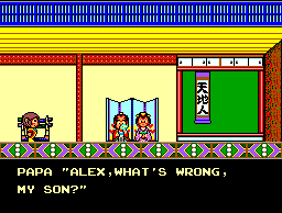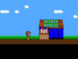 Instead of adventuring to find an arcade, Anmitsu is trying to visit a new bakery. All of the sprites have been replaced in Alex Kidd: High Tech World, and some dialogue rewritten, though the attempts to westernize it are sloppy at best. The ramen stall from Anmitsu Hime has been changed to a hotdog stall, while the samurai sword is now the gun Alex can find. Despite these changes, High Tech World still has signs which were left in Japanese. Apart from these changes, the games are otherwise identical.