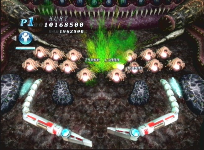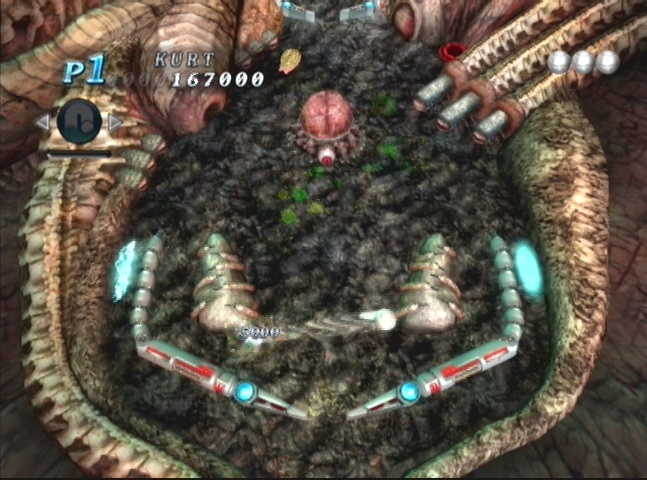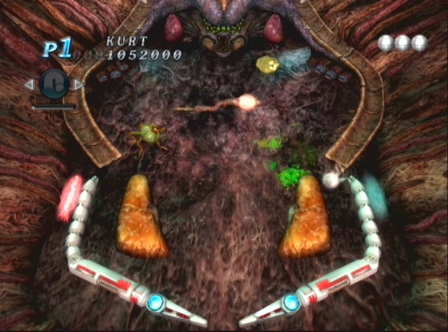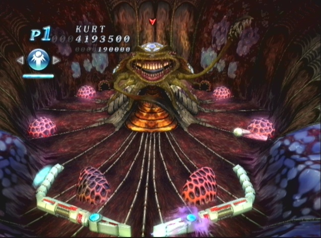 The game is fully rendered in 3D, and successfully carries the design of the Compile developed games through to current-gen systems. Alien ‘bumpers’ and obstacles spit purple fluids, destroying an alien with repeated hits causes it to explode in a green cloud of ichor, and the lighting and sound effects have a satisfying ‘wetness’ about them. The music has suffered from the jump to a new developer though: it’s pretty standard techno.