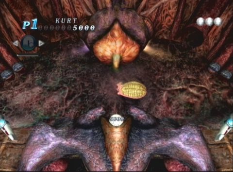 The concept behind Alien Crush Returns is the same as it’s TurboGrafx-16 predecessor: play pinball on Giger-esque ‘xenomorph’ themed tables. There are three different tables included in the original game, and more will eventually be available for download as DLC. There are two ‘boss’ tables as well, but they’re only available in ‘story mode’. The controls utilize the wiimote and nunchuck, with the Z and B buttons controlling your flippers. A shake of the wiimote nudges the table. Also new to the series are ‘action balls’, balls you unlock that have different properties, such as temporarily splitting in two.