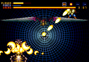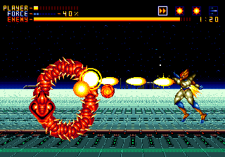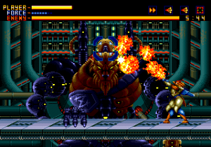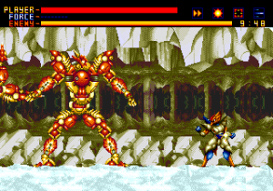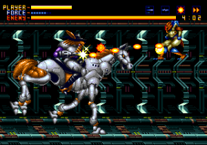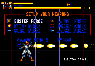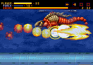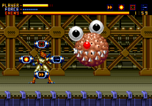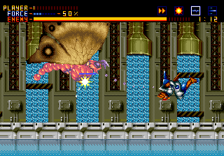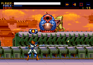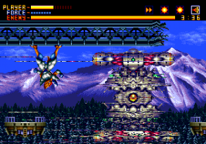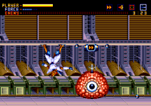In Alien Soldier, you control a gigantic bird-like human named Epsilon-Eagle, as you fight the forces of the evil Xi-Tiger. It uses an expanded version of the Gunstar Heroes control scheme for maximum xenomorph destruction; allowing the player to select between the fixed & free shot options – in the middle of gameplay this time – as well as four separate weapons with limited ammunition. There are six weapons in total, which are selected at the beginning of each stage and can be selected by hitting A during the game. It also introduces a neat teleport ability which allows the player to dash to either side of the battlefield with a simple Down + L or R + C, and limited hovering for attacking in the center part of the screen. The aforementioned Zero Teleport also allows for a devastating attack when used with full life energy. The player becomes an infernal Phoenix and annihilates everything in their path, using a small amount of life energy in the process. The teleport is the key to progression. You can also switch gravity and walk on the ceiling, which is the key to a number of boss fights.