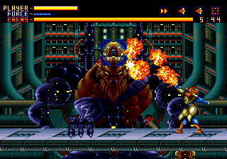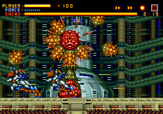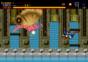 Graphically, if you’ve played Gunstar Heroes, or any other Treasure game for that matter, you know what to expect. Over-the-top special effects, parallax, large, multi-jointed sprites, ultra-fast gameplay with no slowdown…the good stuff. The best things about the main character visually are that he is nicely animated and about twice the size of the Gunstars; or as large as a character from a one-on-one fighting game, even though it difficult to dodge smaller bullets. The various bosses are all well-rendered, some are quite large, and their art design ranges from interesting to downright weird, including the return of the weird floating eyes/nose/teeth boss that showed up in Black’s palace in Gunstar Heroes. Per usual Treasure standard, almost all of them are remarkably cool. One of the best is when you’re flying up a tower, holding on to the back of a gigantic insect. Almost without warning, it gets tangled in a web, where you then need to fight the monstrous mechanical spider than spun it. Even an updated Seven Force makes an incredibly intense appearance. Schizophrenic art aside, one thing is certain; the Genesis is running at its absolute shining apex here and we are thankfully along for the ride.