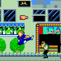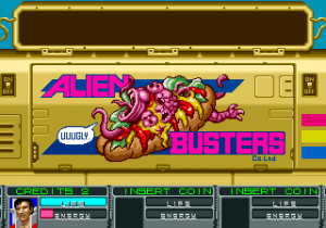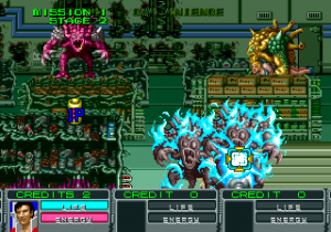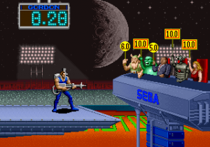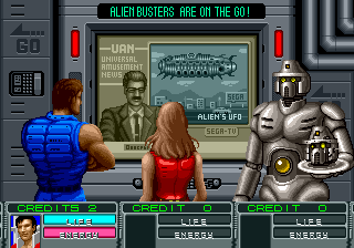 While the Genesis version looks almost visually identical to the arcade version, it’s missing numerous substantial details. The arcade game opens with a three heroes working a food truck called “Alien Burgers”. When the attack begins, the sign flips over to reveal their true name as “Alien Busters”, before launching into action. There are a few other cutscenes that precede the levels, like the ones with the heroes watching news broadcasters, that are replaced with simple scenes of aliens terrorizing the citizens. A handful of enemies, including the slime pools and variations on the snail enemy, are missing. The scaling effects in the shooting galleries are gone – blowing up everything in sight isn’t nearly as impressive when you don’t have bits of debris flying at the camera. While citizens still morph into aliens, then are no longer eaten and killed by them.