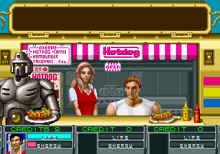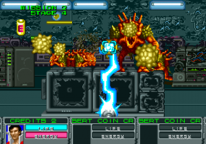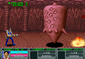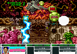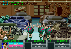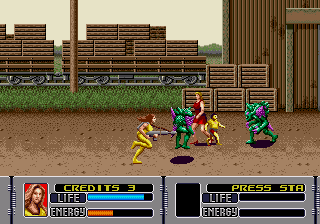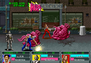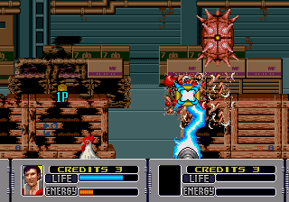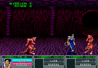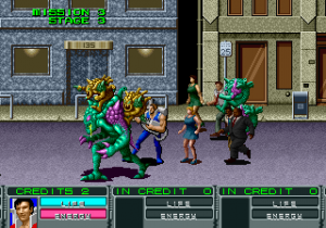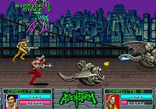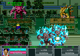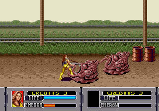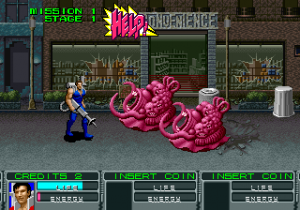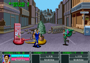 Mechanically, Alien Storm is quite similar to its predecessor. There are three characters: Gordon is the male who wields a lightning gun, Karla is a female with a flamethrower, and Scooter is a robot with a lightning whip. (They are named Garth, Karen and Slammer, respectively, in some versions.) Similar to magic spells there is a screen clearing attack, which eats up a sizeable portion of the player’s “Energy“ bar. Gordon summons a helicopter, Karen calls in a miniature nuke, and Scooter detonates himself. Also, rather than a jump button there is a roll maneuver. In certain versions, three players can also fight aliens simultaneously. There are minor differences between the two- and three-player versions – Gordon and Karla wear either red and yellow, or blue and red, respectively, and the levels are in a different order. However, when the Energy gets too low, then your weapons no longer function, and you are reduced to low-strength melee attacks. Also, rather than a jump button, there is a roll maneuver, which can also be used as a shoulder tackle. This not only feels limited, but also rather redundant considering that your characters can still dash and attack, as in Golden Axe.