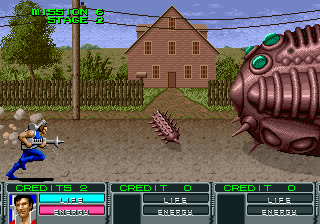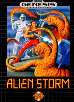 Outside of its initial arcade release, Sega ported Alien Storm to the Genesis and Master System, though the latter was only released in Europe and Brazil. While the fundamentals are the same in all, the level breakdowns and backgrounds are different across all three. The arcade and SMS versions begin in a city block, while the Genesis release starts out on a farm. The SMS port has an exclusive segment where you run through the subway, while the Genesis version also has an additional level in a laboratory. The final areas in the arcade version, where you assault the alien battleship, takes place over three separate, rather repetitive stages, whereas these areas are condensed in the home ports. Outside of the final boss (a gigantic brain with a single eye which is fought in a shooting gallery scene), there is only one other boss in the arcade version, which has three different forms. These were broken out into separate enemies for the other versions.