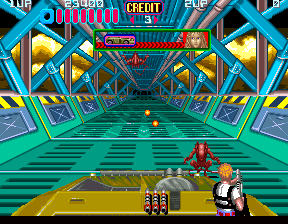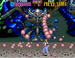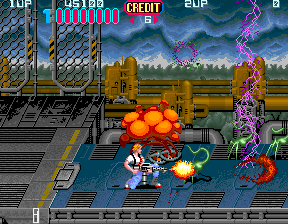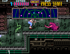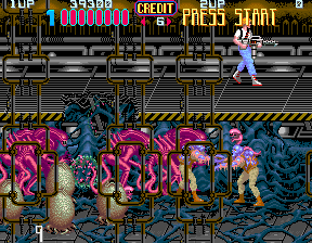 The Alien movies were a huge inspiration for Konami’s Contra, so it would only make sense that they’d eventually pick up an official license for it. Strangely, this game – based on the second movie, Aliens – was released in the arcades in 1990, a few years after the release of the movie. (The other Aliens games were licensed by Activision and Square, for release on home computers in America/ Europe and Japan, respectively.) The characters are technically unnamed, but you can logically assume that you take the roles of Ellen Ripley and Corporal Hicks as you fight through an infested industrial compound. The game plays like a combination between Contra and a beat-em-up – while it’s all shooting action, you can move up and down in the scenery, and you have a life bar. You can’t jump, but you do have the ability to duck and fire, which not only lets you hit crawling aliens, but also makes you a smaller target.
