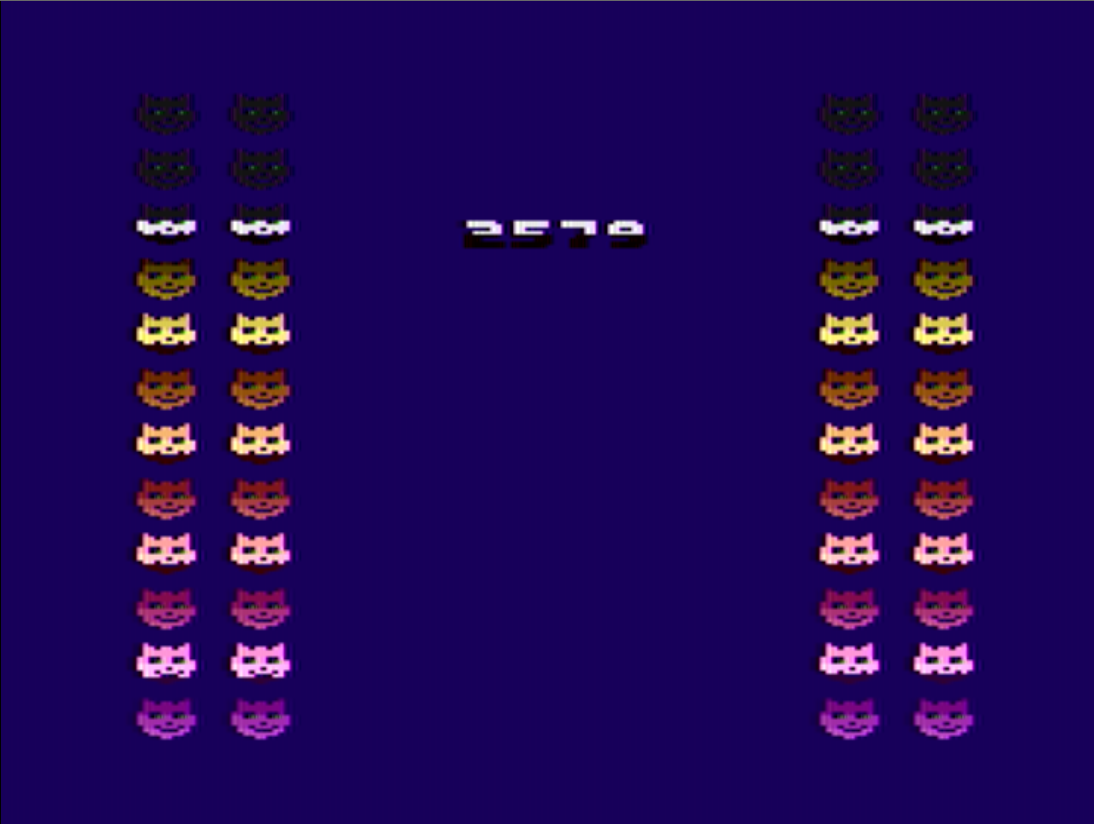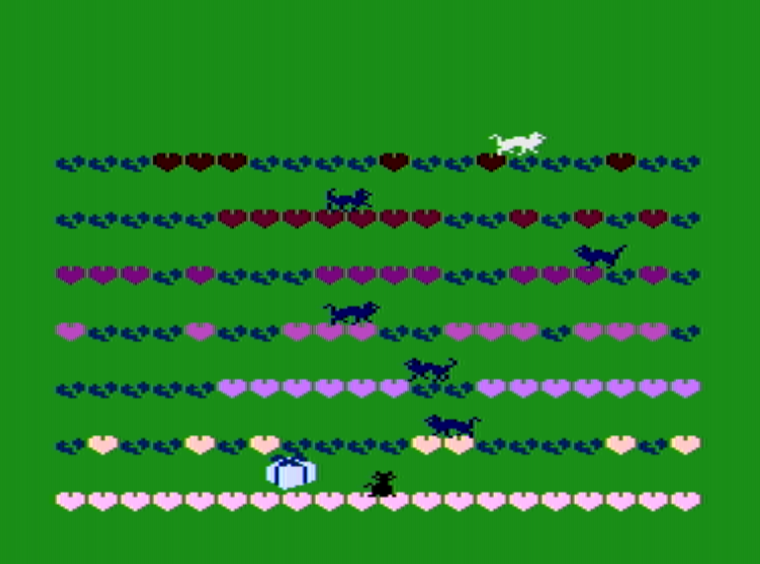 But if you’re successful and you touch the top cat (which means you kiss Felicia), the level advances by one and you get an additional life. The difficulty increases, and the enemies become faster. The multiplier has a threshold of 30, then it just stays the same. And then you proceed strictly for the maximum high score, as the arcade nature of the game suggests.