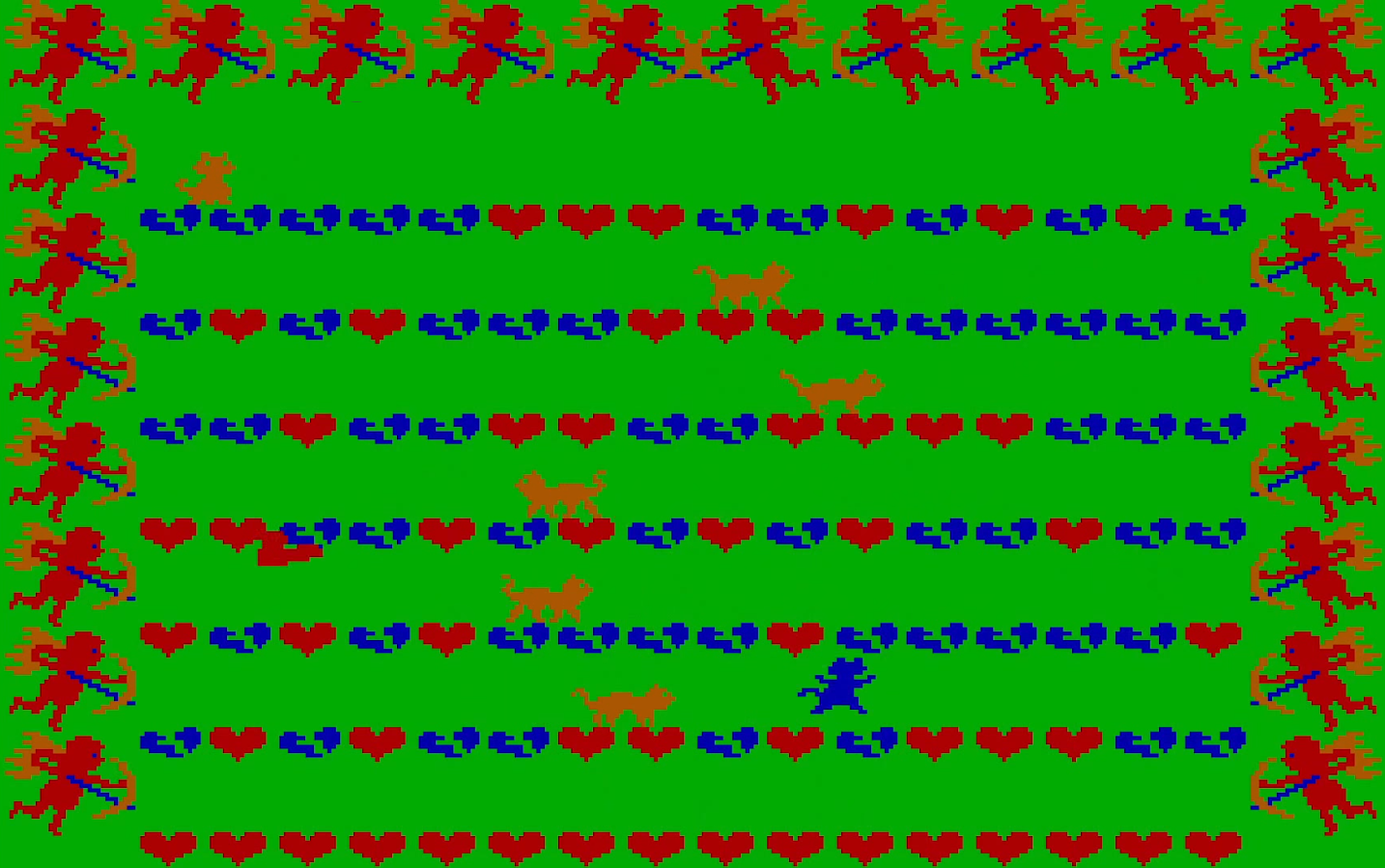The stage is the hardest of them all – it’s a room with platforms made out of valentine hearts, with other rival cats who walk on them. Felicia and all these cats share the same orange color sprite, which is confusing. The top orange cat is Felicia, the other ones you need to avoid, otherwise you fall down a level if they touch you (they, however, do not fall). Of course that’s not all, as there are also static cherubs all over the screen, shooting diagonally at the poor cat, making him fall if the arrow touches his fur.