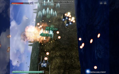 The aforementioned power bar, combined with the scoring system, serves to complicate things even further. By itself, the ship very slowly recharges its power up to gatling level 5. The process can be sped up by collecting crystals dropped by destroyed enemies and cancelled bullets. This is a rather difficult task in blade mode, but the fighter mode automatically and near instantly attracts all crystals, rewarding swapping modes in a firefight. Further incentive is presented via the scoring system – chains of enemies destroyed in fighter mode give increasing point rewards (up to 25 600 per enemy) and raise blade mode score multiplier from the base 2x up to 16x. Thus the fighter mode favors long chains of weak enemies, while the blade mode is most effective score-wise against strong enemies, and maximizing stage score will depend on careful juggling of both. This time around scoring high even holds an extra incentive for 1CC runs: unlike in KAMUI or RefleX, there are extra lives awarded at certain point milestones.
