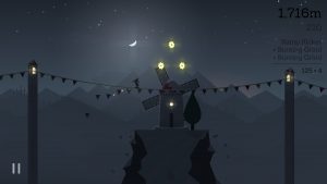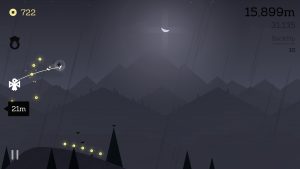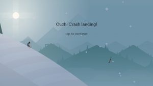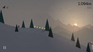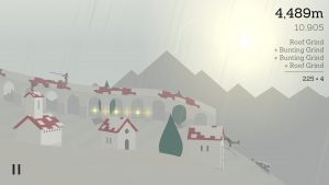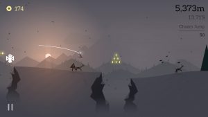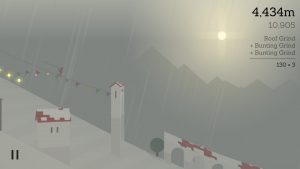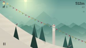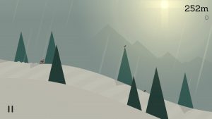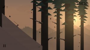 Alto’s Adventure has you snowboarding down an endless mountain, where all you can do is jump by tapping the screen and perform a backflip by holding the screen mid-jump. However, this isn’t automatic, so you’ll have to consider whether you have enough time to backflip before you hit the ground. Jumping is very important, since it allows you to jump onto rails, over rocks and fireplaces (and onto them if you time it right), and is used to tie these various tricks together to create combos. Getting a good combo gives you momentum, which grants you the boost in speed needed to break rocks and jump over the vast chasms scattered across the mountain.