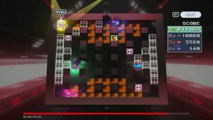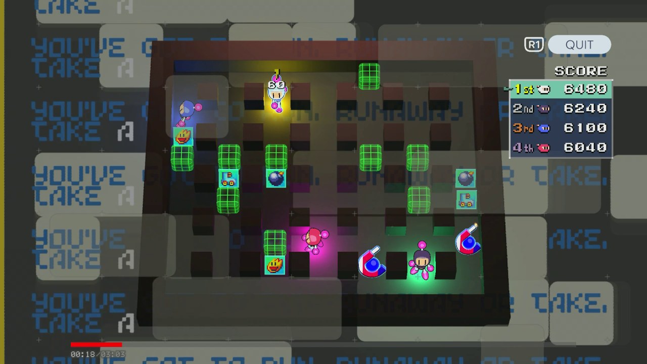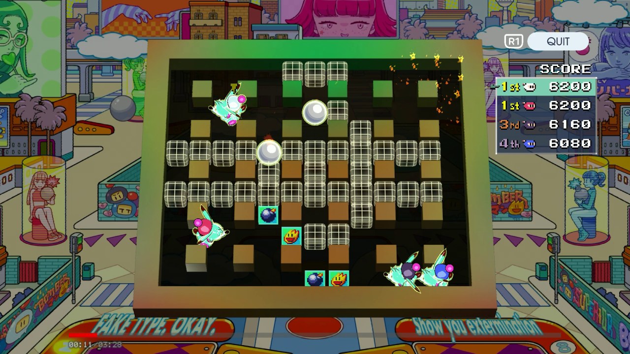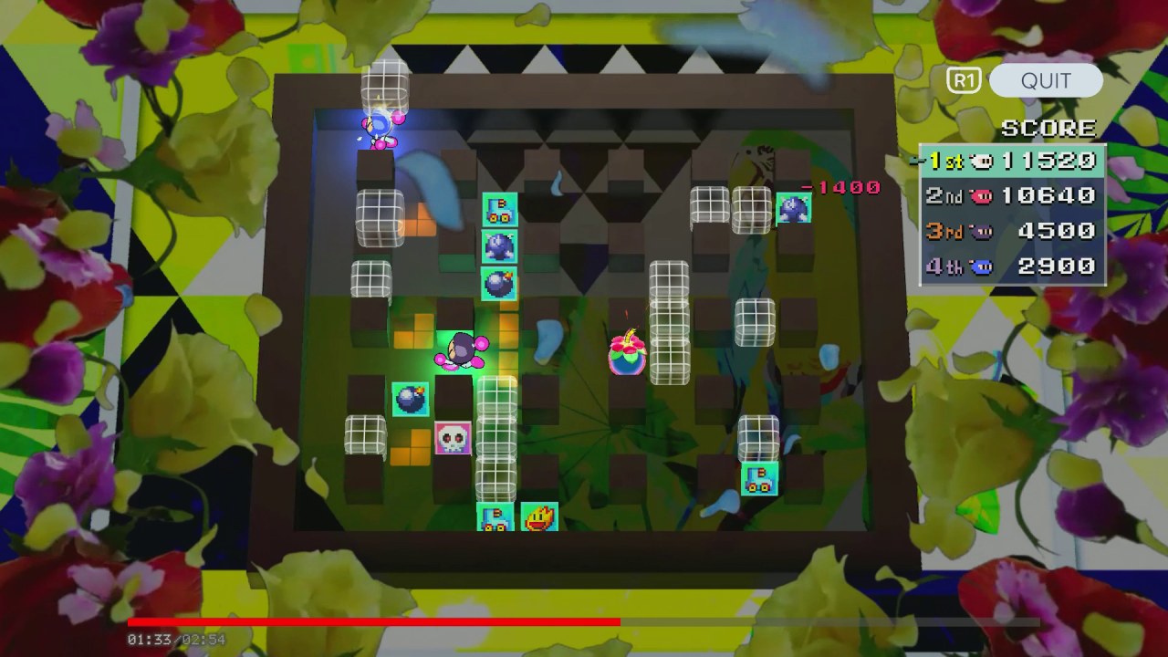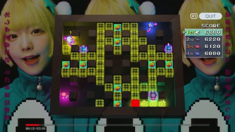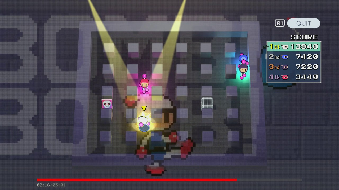 In a smart move designed to counteract the bombastic visuals while still remaining cohesive with the premise, the Bomber in the lead will have a spotlight on them at all times, encouraging everyone to gang up on the current star of the show. Instead of only having one life to win a game with, players now respawn every time they’re knocked out and the goal is to amass the highest number of points before the song ends. Earning any kind of KO gets you points as does blowing up soft blocks (self-destructs make you lose points), but defeating the number one player gets you an “Amazing!” bonus and significantly more points, making it the most tactically sound option. It’s a system that works well within the chaotic context of Bomberman multiplayer – the player in the lead is probably skilled enough to make a 3v1 interesting and the constant tallying of points and changing of rankings makes it very enticing for players to backstab each other at a moment’s notice, all of which gives each round a back and forth that makes for some unpredictably exciting outcomes.