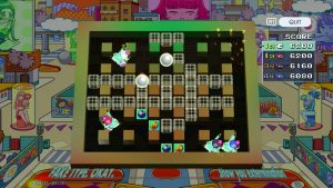 Depending on the selected stage, in-game elements will sync up with the music and the visuals will reflect the song accordingly. Explosions occur on the beat, soft blocks reappear by slamming down from the sky in tune with the music, and rhythmic sound effects unique to each level occur depending on what actions are taken. The bombs you use in each level have differing appearances based on the genre of music; in the disco-inspired “Midnight Fever” stage, bombs will look like disco balls, and for “Bomb, Bomb! Blow’em All”, the bombs will look like 2D objects to match up with the retro Bomberman visuals going on in the background. This idea gives each level a unique tempo, resulting in some that feel more hectic than others. This can also be complemented with some of the chosen rulesets and variable timers depending on the length of the song. The short length of the song “Arouser” pairs very well with its harsh techno sounds and “Max Firepower” ruleset that ensures games on that stage are always high octane, whereas the gentler sound of “Bubble Addiction” and its “Old-School” ruleset makes it the most approachable level to start with for beginners and those who have been out of the Bomberman loop for a while. The variety on offer makes Amazing Bomberman a visually gorgeous game, but it also makes it an incredibly busy one, oftentimes to the detriment of its players. Because of all the visual effects, moving background images, and multicolor explosions, losing track of yourself and nearby bombs can happen frequently. Certain stages won’t hesitate to have background elements fly into the foreground and block your vision, while other stages rely heavily on flashing lights, which is both distracting and perhaps potentially dangerous to those sensitive to said flashing lights.