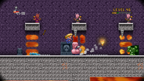 The game’s only true weak point are the bosses – the first two are laughably easy, then the third fight becomes unfair all of a sudden, with two giant golems who can fill the entire screen with doom, minus just a few pixel lines in between, which are invisible because their hit box wildly differs from the actual sprites. When a minion happens to walk into that spot at exactly the wrong time, taking damage is all but unavoidable. (Pro-tip: it’s better to run into the minion and take lesser damage thanks to the few frames of invincibility.) The huge monsters are also made with Flash-style animation, as opposed to the pixel art used for all other sprites. About half of them don’t clash too badly with the rest of the graphics, but the stage 1 and 3 bosses look extremely sketchy and unpolished, as if the artist just gave up at that point.