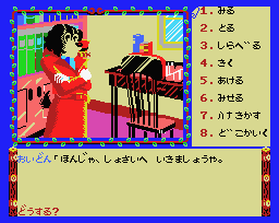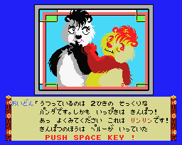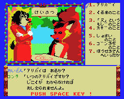 Enix kickstarted the whole mystery Japanese adventure game craze of the 80s with Portopia Satsujin Renzoku Jiken, which was followed up by two sequels, all three of which were helmed by star developer Yuji Horii. Lesser known is this game, Animal Land Satsujin Jiken (“Animal Land Murder Case”), despite following the same mold…except all of the characters are anthropomorphic animals. The story puts you in the shoes of a rookie canine shamus named Oidon, as he investigates the murder of Gonkichi, a fox and owner of a jewelry store. The story gets even darker when the case interweaves with the suicide a panda named Linlin.